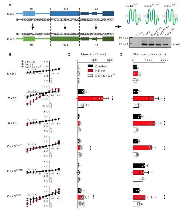 Fig. 4. Cx43 chimeras containing the N-terminus or the extracellular loop 1 of the Cx30 display DCFS activated membrane currents. A: Alignment of the NT-, TM1-, and E1 of Cx30 and Cx43 with the predicted pore-lining residues underlined in the amino acid sequence as well as an illustration of Cx43 chimeras containing the NT, TM1, or the E1 from Cx30. Western blot of oocyte surface expression of Cx43, Cx4330NT, Cx4330TM1, and Cx4330E1 in the right lower corner. B: Summarized I/V curves from uninjected-, Cx30-, Cx43-, Cx4330NT-, Cx4330TM1- and Cx4330E1-expressing oocytes (n=11, n=7, n=9, n=13, n=11 and n=15, respectively): Summarized membrane currents obtained at -60 mV. D: Ethidium uptake in uninjected-, Cx30-, Cx43-, Cx4330NT-, Cx4330TM1- and Cx4330E1-expressing oocytes (all n=5). Data in I/V curves and in the bar graphs are presented as mean ± SD. Statistical significance of DCFS induced hemichannel activity within each group was tested using repeated measures two-way ANOVA (current, interaction: F(10,120) = 137.5, P<0.001; construct: F(5,60) = 92.8, P<0.001; test solution: F(2,120) = 315.5, P<0.001 and Eth, interaction: F(10,48) = 20.3, P<0.001; construct: F(5,24) = 6.2, P<0.001; test solution: F(2,48) = 182.8 P<0.001) with Dunnettâs post hoc test (against control) and marked by asterisks above the bar. ***; P < 0.001. |