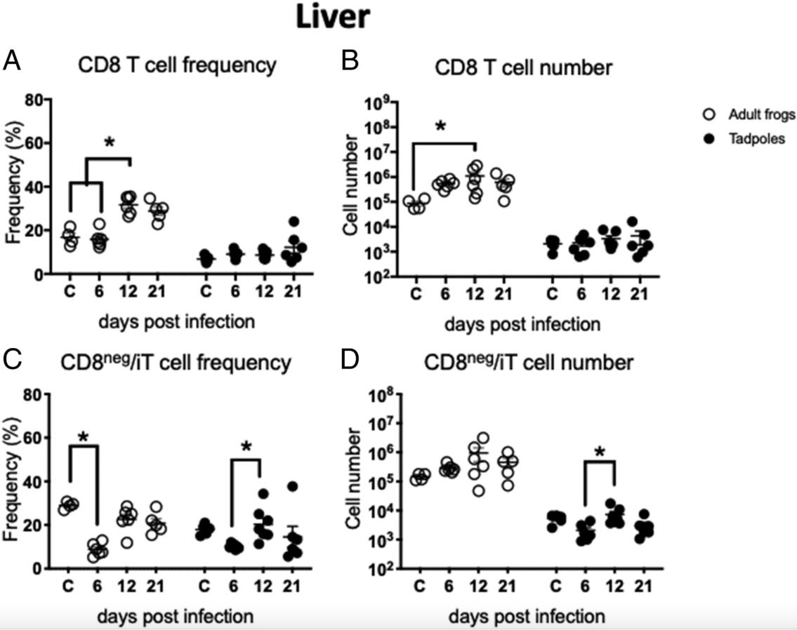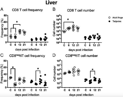 Figure 4. Comparison of the frequency and the number of CD8 and CD8neg T/iT cells in the liver of adults and tadpoles during M. marinum infection. Using the flow cytometric strategy shown in the Fig. 2, the kinetics of CD8 T cell (A) frequency, and (B) number were determined in adults (white) and tadpoles (black) at different days postinoculation (n = 6â7 per group from two independent experiments). Furthermore, the kinetics of CD8neg T/iT cell (C) frequency and (D) number were determined. Asterisks indicated statistical significance by the KruskalâWallis test, nonparametric. C, uninfected control.