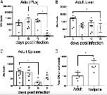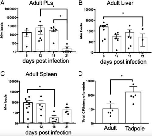 Figure 6. Determination of M. marinum loads and dissemination using an absolute quantification method and a recovery of live M. marinum in culture from adults and tadpoles of X. laevis. Adult frogs were i.p. inoculated with 1 à 106 CFU of M. marinum, and then M. marinum loads were determined using a real-time PCR with M. marinumâspecific 16S rRNA gene (AâD). (A) PLs and (B) liver and (C) spleen tissues were taken at the indicated dpi. The dashed line indicates the level of detection by real-time PCR. To measure only the live and replicating M. marinum, we cultured kanamycin-resistant M. marinum from the inoculated adults and tadpoles at 21 dpi using a Middlebrook 7H10 media supplemented with 50 μg/ml kanamycin. (D) Quantitative measurement of CFU was then normalized to total milligrams of homogenates. Asterisk indicates p < 0.05 by KruskalâWallis nonparametric test.