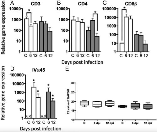 Figure 7. Relative expression of T cellârelated immune genes in the liver of M. marinumâinoculated adults and tadpoles. Four-month-old young adults (white bar) and 3-wk-old tadpoles (gray bar) were i.p. inoculated with 1 à 106 or 3 à 105 CFU of M. marinum, respectively (n = 5â6 per time point). Relative gene expression in liver for (A) CD3ε, (B) CD8β, (C) CD4, and (D) iVα45-Jα1.14 was normalized to the housekeeping gene gapdh. (E) Ct values for gapdh of each time point between adults and tadpoles. Asterisks indicate a significant difference by the KruskalâWallis test (p < 0.05). C, uninfected control; u.d, undetected value.