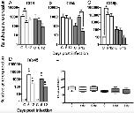 Figure 8. Relative expression of immune receptor genes and pro- and anti-inflammatory cytokine genes in the liver of M. marinumâinoculated adults and tadpoles. Four-month-old young adults (white bar) and 3-wk-old tadpoles (gray bar) were i.p. inoculated with 1 à 106 or 3 à 105 CFU of M. marinum, respectively (n = 5â6 per time point). The relative gene expression in the liver was determined for the immune gene receptors (A) CSF-1R (macrophage recruitment marker), (B) G-CSF-R (neutrophil recruitment marker), and (C) CCR2 (inflammatory monocyte marker); for the proinflammatory cytokine genes (D) TNF-α, (E) IL-1β, and (F) iNOS; and for the anti-inflammatory cytokine genes (G) TGF-β and (H) IL-10. All the data were normalized to the housekeeping gene gapdh. Asterisks indicate significant difference by the KruskalâWallis test (p < 0.05). C, uninfected control.