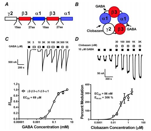 ((AGS)5LGS(AGS)3), 18 amino acids (AGT(AGS)5), and 27 amino acids ((AGS)4AGT(AGS)4). B, schematic of the expected arrangement of the concatenated receptor where the subunits arrange in a counter-clockwise orientation. GABA- and clobazam-binding sites are shown. C, representative data (above) from a single two-electrode voltage clamp experiment where different concentrations of GABA (open bars) were applied to construct a concentration–response curve to GABA (below). Filled bars, reference 3 mM GABA applications; open bars, GABA applications at concentrations shown. Peak currents were measured, and the mean S.E. (error bars) was plotted (open circles) and fitted to the Hill equation (below). D, representative data (above) from a single two-electrode voltage clamp experiment constructing a modulation curve to clobazam (below). Three pulses of reference 10 M GABA (closed bars) were applied prior to co-application of 10 M GABA and clobazam at concentrations shown (closed bars). Percent modulation of the control GABA response was calculated, and the mean S.E. was plotted and fitted to the Hill equation (below). The fitted EC50 of clobazam was 86 nM (log EC50 4.03 0.06, mean S.E., n 10), and the fitted Emax was 306% (320 32, mean S.E., n 10). |