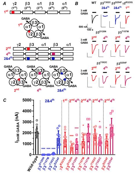 Figure 3. A, schematic of concatenated receptor indicating the location of mutations when they are introduced into the 2 or distinct 3 subunits. Red circles