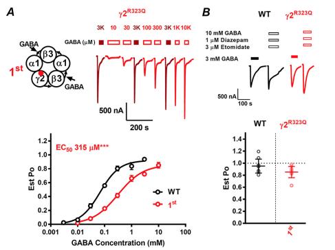 representative data (right) from a single two-electrode voltage clamp experiment where different concentrations of GABA (open bars) were applied to construct a concentration–response curve to GABA at 2R323Q-3-1-3-1 receptors. Filled dark red bars and traces represent reference 3 mM GABA applications, and open red bars and traces represent GABA applications at the concentrations shown. Shown is a concentration–response curve to GABA (below) of WT2-3-1-3-1 (E) and 2R323Q-3-1-3-1 (E) receptors normalized to the Est. Po(max) and fitted to the Hill equation.Dots, mean S.E. (error bars) of 10 –13