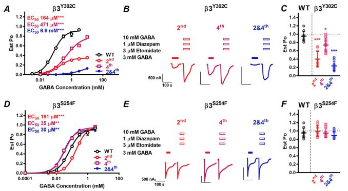 Figure 6. A, concentration–response curve to GABA of WT 2-3-1-3-1 (open black circles), 2-3Y302C-1-3-1 (open red circles), 2-3-1-3Y302C-1 (open purple squares) and 2-3Y302C-1-3Y302C-1 (closed blue circles) receptors normalized to the Est. Po(max) and fitted to the Hill equation.Dots, mean S.E. (error bars) of 10 –13 individual experiments. The EC50 of the mutant receptor derived from the curve fit is shown. *, p 0.05; **, p 0.01; ***, p 0.001