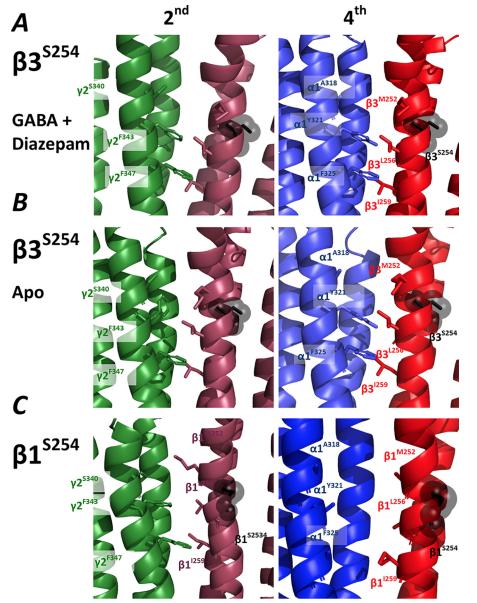 3D120N residue at the GABA-binding site, the 3T157M residue within an internal -sheet, the 3Y302C residue in the M2-M3 loop, and the 3S254F residue in the