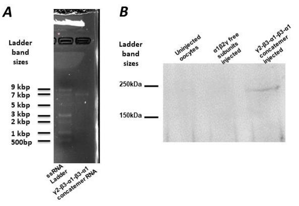 SI 1. (A) RNA gel of concatenated receptor showing single RNA band at the expected size of ~7.5 kb. (B) Western blot with uninjected oocytes, oocytes injected with loose subunits or the concatenated construct. Concatenated receptor is translated at the expected size without any additional fragments. |