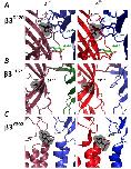 different subunit locations of the second3 subunit(left) and fourth 3 subunit (right).The subunits are colored with the first2 subunit in green, the second 3 subunit in maroon, the third 1 subunit in light blue, the fourth 3 subunit in red, and the fifth 1 subunit in dark blue and the GABA molecule in blue, red, and green. Residues from the adjacent 1 or2 subunits are indicated. At the 1D120 (A), 1T1577 (B), and 1Y302 (C) residues, the interacting partners are identical residues either on the adjacent subunit or within the 3 subunit itself. |
