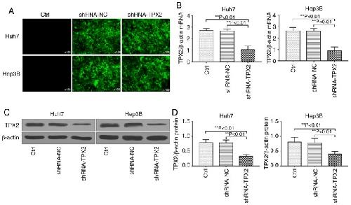 Figure 2. TPX2 expression is downregulated in cells transfected with pMagic4.1-shRNA-TPX2. (A) Green fluorescence was observed following transfection. Magnification, x100. (B) mRNA and (C) protein expression levels of TPX2 in Huh7 and Hep3B transfected with the shRNA-TPX2 vector. (D) Densitometry analysis of TPX2 protein expression levels in (C). **P<0.01. Data are presented as the mean ± standard deviation. TPX2, targeting protein for Xenopus kinesin-like protein 2; sh, short hairpin; Ctrl, untransfected control; NC, negative control plasmid.