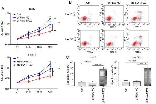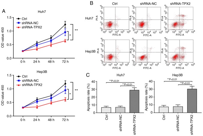 Figure 3. Effects of TPX2 silencing on the proliferation and apoptosis of Huh7 and Hep3B cells. (A) A Cell Counting Kit-8 assay was used to detect the proliferation of Huh7 and Hep3B cells. *P<0.05, **P<0.01. (B) Representative dot plots of apoptosis in Huh7 and Hep3B cells. (C) Quantitative analysis of apoptosis in Huh7 and Hep3B cells transfected with an shRNA-TPX2 or shRNA-NC plasmid. **P<0.01. Data are presented as the mean ± standard deviation. TPX2, targeting protein for Xenopus kinesin-like protein 2; sh, short hairpin; Ctrl, untransfected control; NC, negative control plasmid.