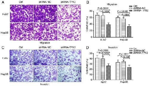 Figure 4. Effect of TPX2 silencing on the migration and invasion of Huh7 and Hep3B cells. (A and B) Effect of TPX2 knockdown on cell migration and (C and D) invasion of Huh7 and Hep3B cells was examined using a Transwell assay. Data are presented as the mean ± standard deviation. TPX2, targeting protein for Xenopus kinesin-like protein 2; sh, short hairpin; Ctrl, untransfected control; NC, negative control plasmid.