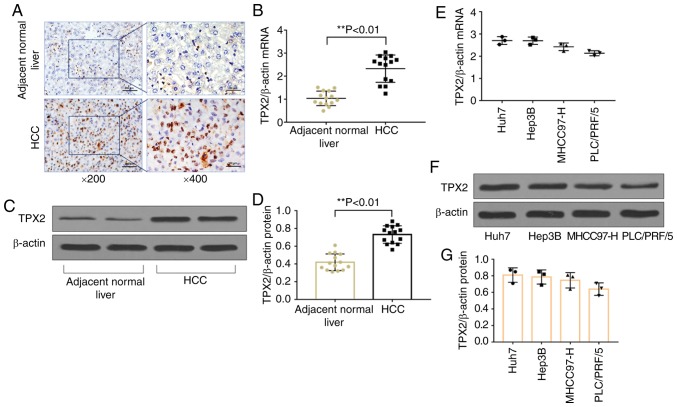 Figure 1. TPX2 expression levels in HCC tissues and liver cancer cell lines. (A) Representative immunohistochemical stain of TPX2 expression in patients' tissues. (B) mRNA expression levels of TPX2 in HCC tissues and the adjacent normal livertissue. **P<0.01. (C) Representative western blot of TPX2 protein expression levels in HCC tissues and the adjacent normal livertissue. (D) Densitometry analysis of TPX2 protein expression levels in (C). **P<0.01. (E) mRNA and (F) protein expression levels in the liver cancer cell lines, Huh7, Hep3B, MHCC97-H, PLC/PRF/5. (G) Densitometric analysis of TPX2 protein expression levels in (F). Data are presented as the mean ± standard deviation. HCC, hepatocellular carcinoma; TPX2, targeting protein for Xenopus kinesin-like protein 2.