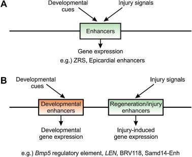 Fig. 1. Diverse classes of regeneration/injury enhancers (A) Enhancers shared between development and regeneration/injury. The ZPA regulatory sequence (ZRS) and Raldh2 and Wt1 epicardial enhancers are activated by developmental and injury cues. (B) Regeneration/injury-restricted enhancers. Distinct enhancers are activated by development and regeneration. Bmp5 injury responsible elements, lepb-linked regeneration enhancer (LEN), Drosophila wnt-associated damage-induced enhancer (BRV118), and Samd14-Enh are responsible for regeneration or injury, but not development.
