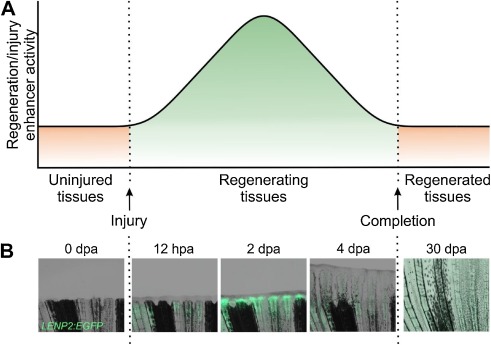 Fig. 2. Dynamic activity of regeneration/injury-associated enhancers. (A) Regeneration/injury enhancer activity. Regeneration/injury enhancers are not active in uninjured tissues. Upon injuries, regeneration/injury enhancers are activated to drive target gene expression and their activity is maintained during regeneration. When regeneration or injury is resolved, the activity of regeneration/injury enhancers is returned to the level of the uninjured tissues. (B) Example of dynamic regeneration enhancer activity. Zebrafish LEN is not active in uninjured fin (0 day post-amputation (dpa)). Fin amputation activate LEN to direct reporter gene expression (12 h post-amputation (hpa)). LEN activity is maintained during regeneration (2 and 4 dpa). When fin regeneration completes (30 dpa), LEN activity is decommissioned and thus reporter gene expression is not detectable. (B) is adapted from [18].