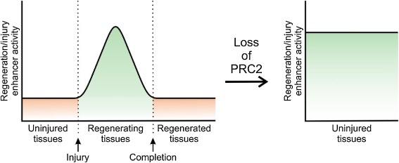 Fig. 3. Silenced regeneration/injury enhancer in uninjured tissues. After peripheral nerve injury, injury-induced enhancers emerge in Schwann cells. However, the loss of PRC2 activity results in aberrant activation of injury-induced enhancers in uninjured cells, leading to upregulation of myelin-regulated genes and subsequent hypermyelination and morphological change.