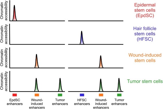 Fig. 4. Tumor hijacks regeneration/injury enhancers for infinite division. Each track represents ATAC-seq peaks of epidermal stem cells (EpdSCs), hair follicle stem cells (HFSCs), wound-induced stem cells, and tumor stem cells of mouse skin. Under the homeostatic condition, epidermal stem cells (EpdSCs) and hair follicle stem cells (HFSCs) have their own open chromatin signatures. Upon wound injury, lineage-specific open chromatin signatures collapse and wound-specific signatures emerge. Wounded-induced and tumor stem cells exhibit similar global open chromatin profiles, but tumor stem cells display additional tumor-specific ATAC-seq peaks, indicating that misregulation of wound-induced regulatory events can lead to tumor.