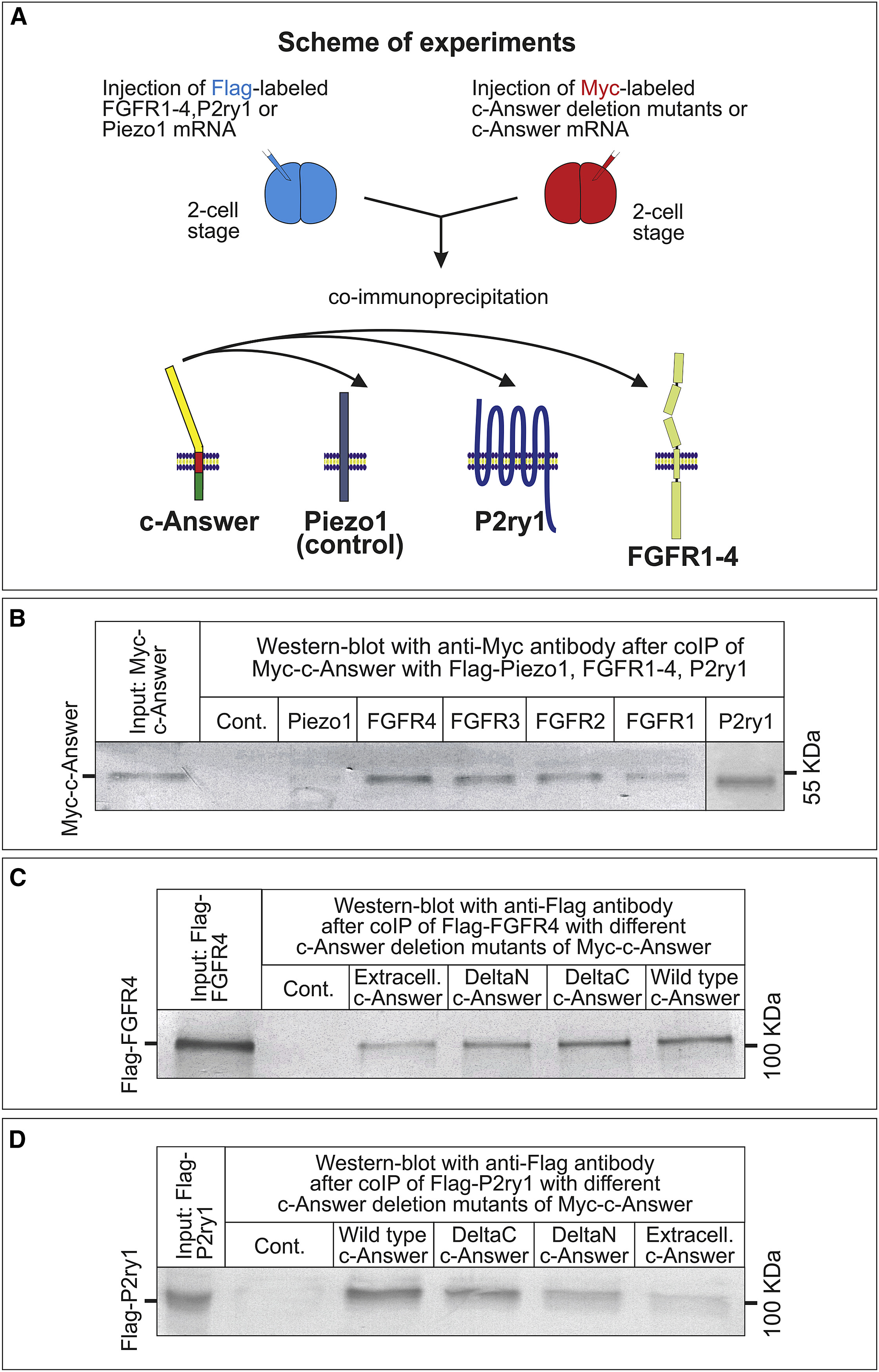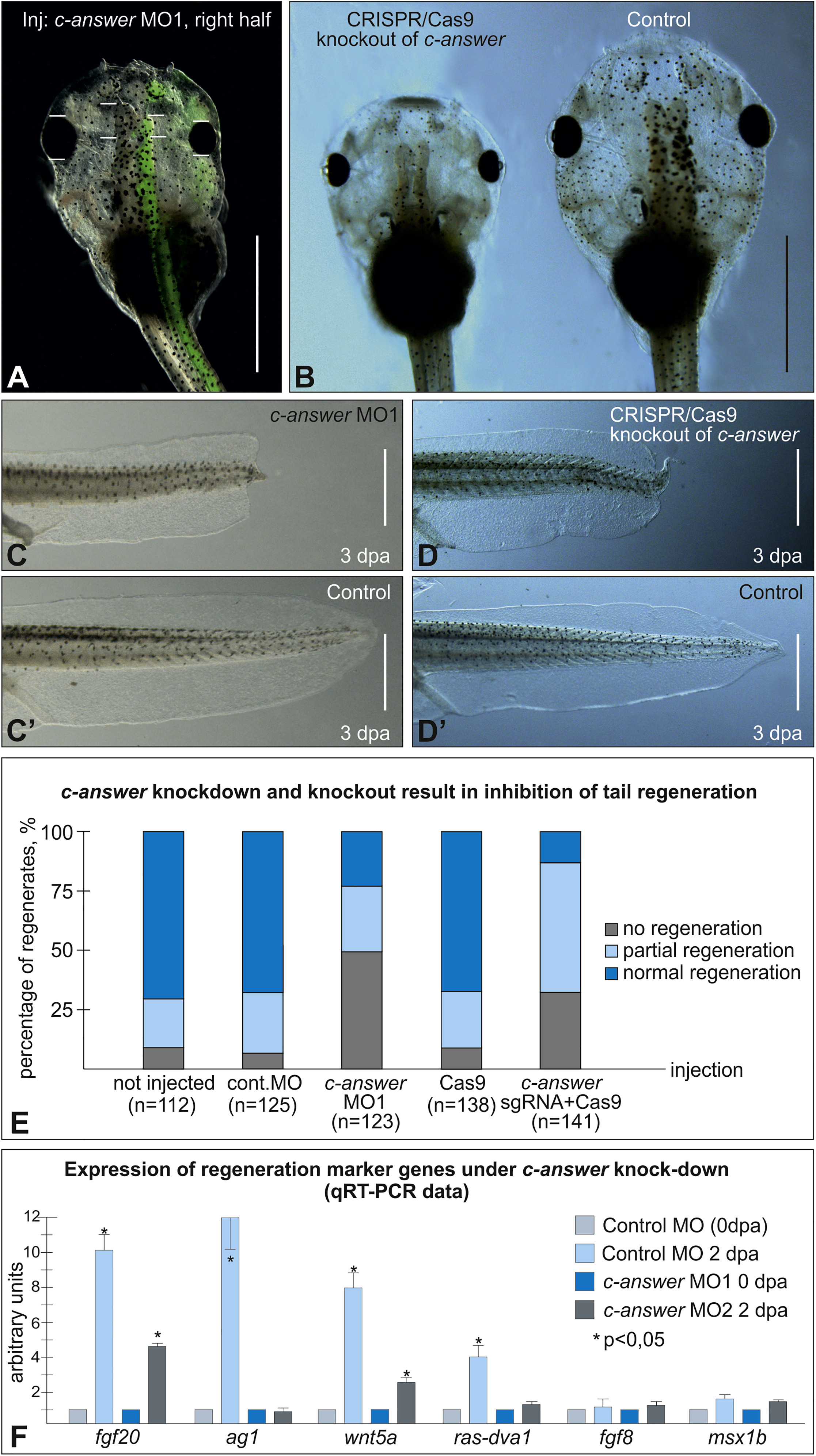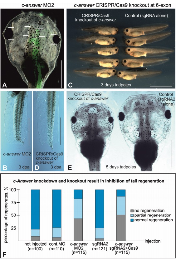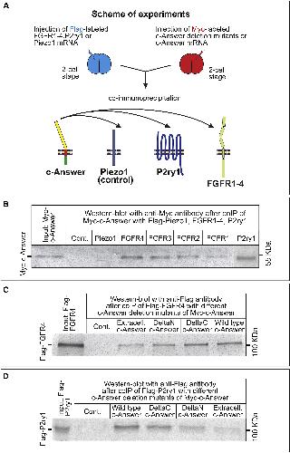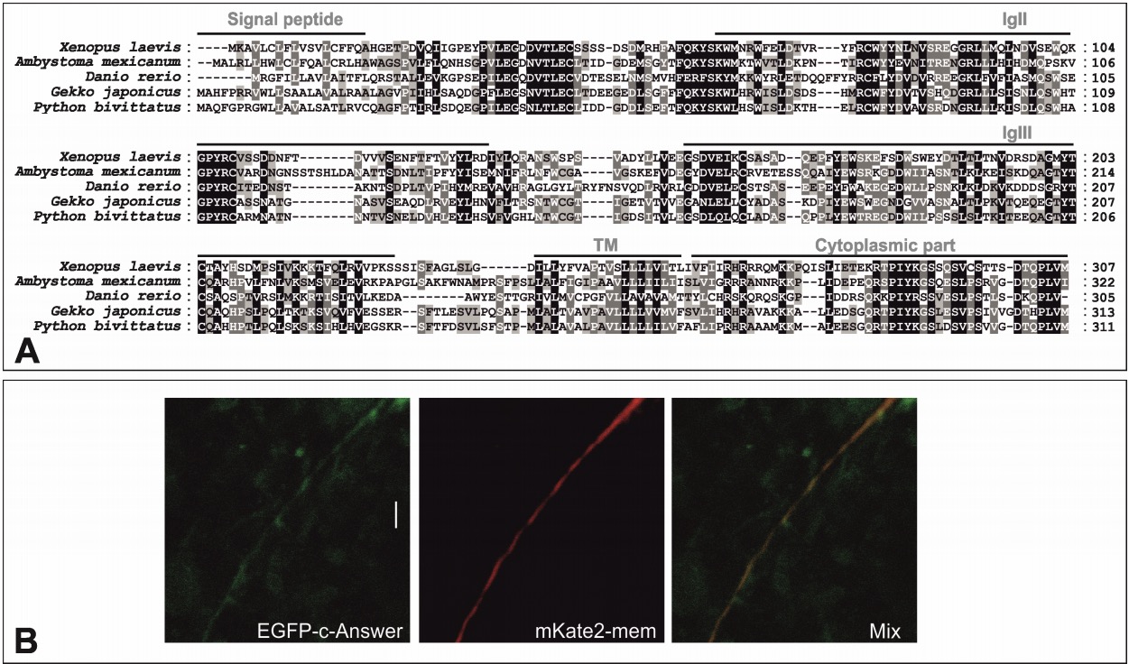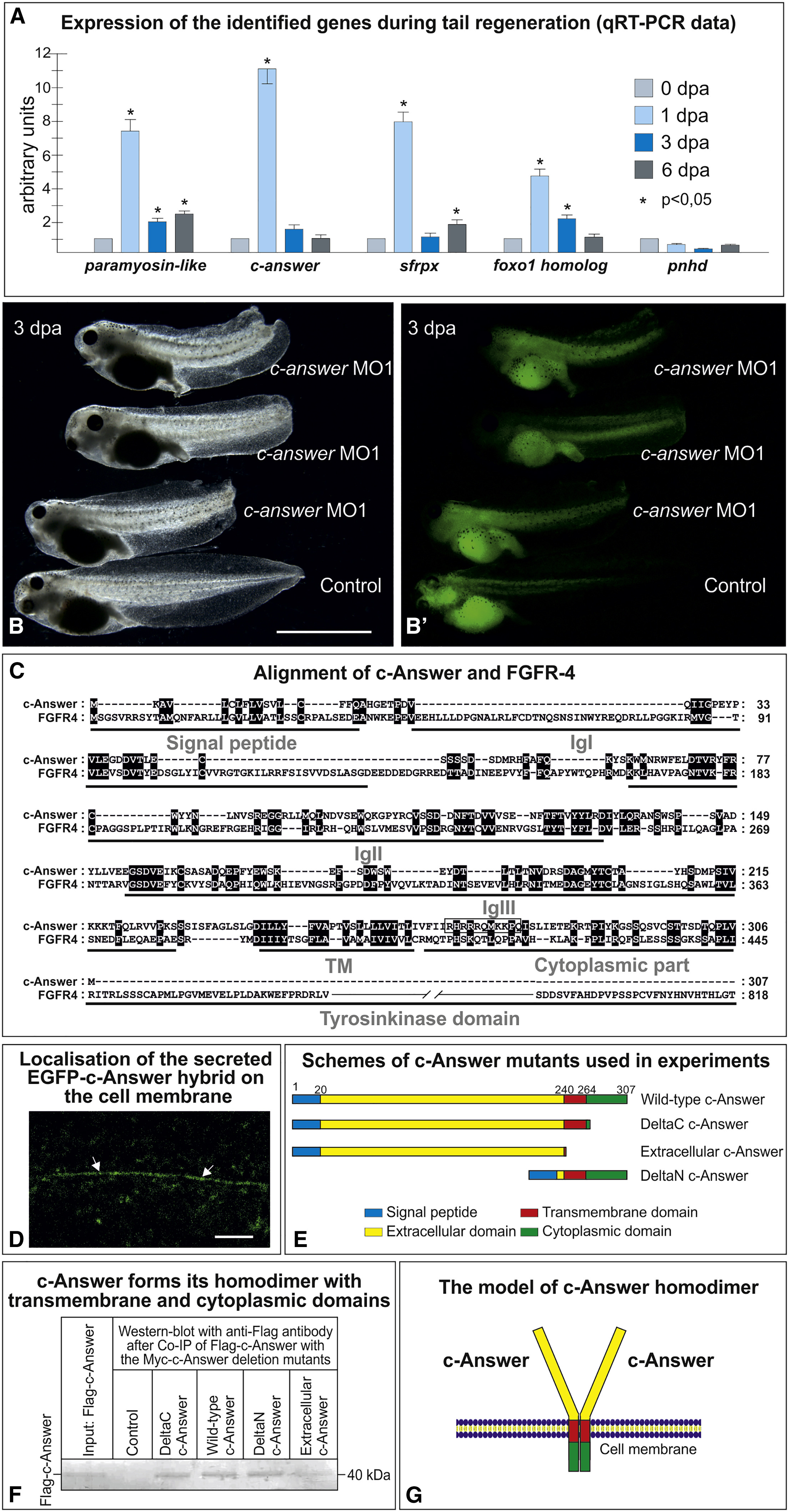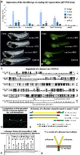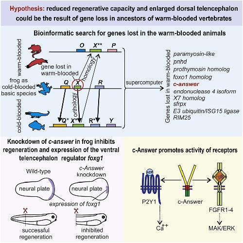The molecular basis of higher regenerative capacity of cold-blooded animals comparing to warm-blooded ones is poorly understood. Although this difference in regenerative capacities is commonly thought to be a result of restructuring of the same regulatory gene network, we hypothesized that it may be due to loss of some genes essential for regeneration. We describe here a bioinformatic method that allowed us to identify such genes. For investigation in depth we selected one of them encoding transmembrane protein, named "c-Answer." Using the Xenopus laevis frog as a model cold-blooded animal, we established that c-Answer regulates regeneration of body appendages and telencephalic development through binding to fibroblast growth factor receptors (FGFRs) and P2ry1 receptors and promoting MAPK/ERK and purinergic signaling. This suggests that elimination of c-answer in warm-blooded animals could lead to decreased activity of at least two signaling pathways, which in turn might contribute to changes in mechanisms regulating regeneration and telencephalic development.