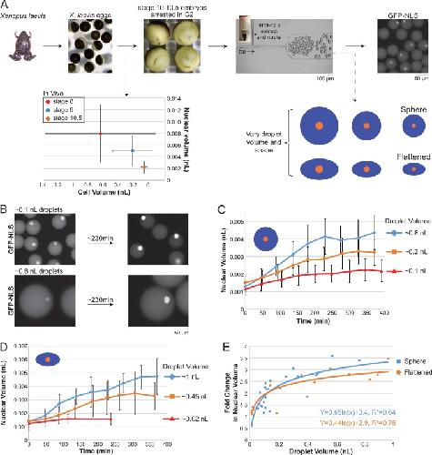 Figure 1. Cytoplasmic volume contributes to nuclear size scaling in X. laevis embryo extracts. (A) Top: Schematic diagram of the experimental approach. Stage 10â10.5 embryos were arrested in late interphase with cycloheximide. Embryonic extract containing endogenous nuclei was encapsulated in droplets using microfluidic devices. Nuclei were visualized by uptake of GFP-NLS. Bottom left: In vivo nuclear size scaling data for X. laevis stages 8 to 10.5 (JevtiÄ and Levy, 2015). Bottom right: Blue and orange represent cytoplasm and nuclei, respectively. (B) Spherical extract droplets were incubated at room temperature. (C) Spherical droplet data. At each time point, 18â104 nuclei were quantified (57 nuclei on average). Each curve corresponds to a different extract. (D) Flattened droplet data. The ratio of the long axis to the short axis was on average â¼1.7. At each time point, 10â117 nuclei were quantified (35 nuclei on average). Each curve corresponds to a different extract. (E) The fold change in nuclear volume was calculated by dividing maximum nuclear volume by initial nuclear volume at t = 0. Best-fit logarithmic regression curves are displayed. For each time point of each experiment, 7â311 nuclei were quantified (63 nuclei on average). Data are shown for 26 different spherical droplet volumes (blue) and 12 different flattened droplet volumes (orange), using 23 different extracts. Error bars represent SD. |