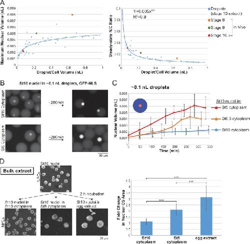 Figure 2. Cytoplasmic composition contributes to nuclear size scaling in X. laevis embryo extracts. (A) Left: Based on the data presented in Fig. 1, CâE, maximum nuclear volume is plotted as a function of droplet volume for stage 10 embryo extract droplets (blue). Right: Nuclear-to-cytoplasmic (N/C) volume ratios were calculated by dividing maximum nuclear volume by droplet volume. A best-fit power regression curve is displayed for the droplet data. Also plotted are previously reported in vivo nuclear size scaling data and nuclear-to-cytoplasmic volume ratios for X. laevis stages 8 to 10.5 (JevtiÄ and Levy, 2015). (B) Stage 10 nuclei were isolated and resuspended in cytoplasmic extract from different embryonic stages. Extract droplets were incubated at room temperature. (C) At each time point, 10â168 nuclei were quantified (80 nuclei on average). The stage 10 extract data are the same shown in Fig. 1 C. (D) Stage 10 extract and nuclei were mixed with stage 5 cytoplasmic extract or egg extract at a 1:10 ratio. After a 2-h incubation, nuclei were fixed and stained with NPC antibody mAb414. Nuclear CS areas were measured and the fold change was calculated relative to the preincubation nuclear size. At least 700 nuclei were quantified for each condition. Data from two independent experiments are shown. Two-tailed Studentâs t tests assuming equal variances; ***, P ⤠0.001. Error bars represent SD. |