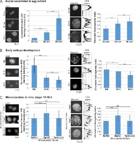 Figure 5. Npm2 levels correlate with nuclear histone levels and altered chromatin topology. (A) Nuclei assembled in X. laevis egg extract for 30, 60, and 90 min were stained with an H2B antibody and Hoechst. Total nuclear H2B staining intensities were measured for â¥60 nuclei per condition and normalized to the 30-min time point. For each nucleus, two Hoechst intensity line scans were acquired through the middle of the nucleus. The SD of all intensity values along each line was calculated and normalized to the average intensity to obtain a value we term the chromatin heterogeneity index. Larger values correspond to a more heterogeneous chromatin distribution. 54â68 line scans were quantified per condition (60 on average). (B) Different stage nuclei were stained with an H2B antibody and Hoechst. Total nuclear H2B staining intensities were quantified for â¥100 nuclei per stage and normalized to stage 12. For chromatin heterogeneity indexes, 22â79 line scans were quantified per condition (45 on average). (C) Microinjection experiments were performed as in Fig. 4 A. Isolated nuclei were stained with an H2B antibody and Hoechst. Total nuclear H2B staining intensities were measured for â¥97 nuclei per condition and normalized to the XB-microinjected controls. For chromatin heterogeneity indexes, 34â52 line scans were quantified per condition (41 on average). Data from four independent experiments are shown. Two-tailed Studentâs t tests assuming equal variances; *, P ⤠0.05; **, P ⤠0.01; ***, P ⤠0.001; ns, not significant. Error bars represent SD. |