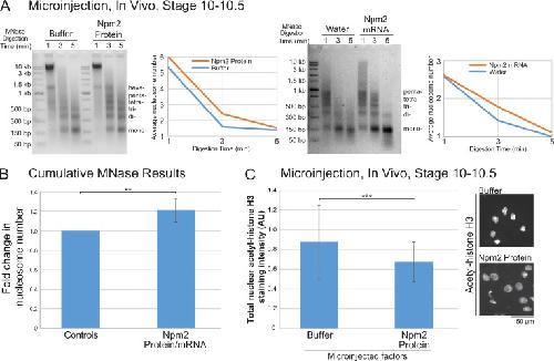 Figure 6. Npm2 increases nucleosome occupancy and decreases euchromatin. (A) On the left, one-cell X. laevis embryos were microinjected with equivalent volumes of XB or recombinant Npm2 protein (to increase the Npm2 concentration by 3.5 µM). On the right, one-cell X. laevis embryos were microinjected with 1 ng wild-type Npm2 mRNA or an equivalent volume of water. Embryos were allowed to develop to stage 10â10.5 and arrested in G2 with cycloheximide. Isolated nuclei were digested with MNase for the indicated times, and purified DNA was separated on 2% agarose gels and stained with ethidium bromide. On average, 60 embryos were microinjected per condition. Band intensities were quantified and used to calculate the average nucleosome number per fragment (see Materials and methods). Representative experiments are shown. (B) The MNase digestion assays described in A were repeated three times for Npm2 protein microinjection and three times for Npm2 mRNA microinjection. Maximum fold changes in nucleosome occupancy between control and Npm2-microinjected embryos were quantified for each experiment and averaged. (C) One-cell X. laevis embryos were microinjected with equivalent volumes of XB or recombinant Npm2 protein (to increase the Npm2 concentration by 3.5 µM), allowed to develop to stage 10â10.5, and arrested in G2 with cycloheximide. On average, 25 embryos were microinjected per condition. Isolated nuclei were stained with an acetyl-histone H3 antibody, and representative images are shown. Total integrated nuclear acetyl-histone H3 staining intensity was measured for â¥168 nuclei per condition. One representative experiment of two is shown. Two-tailed Studentâs t tests assuming equal variances; **, P ⤠0.01; ***, P ⤠0.001. Error bars represent SD. |