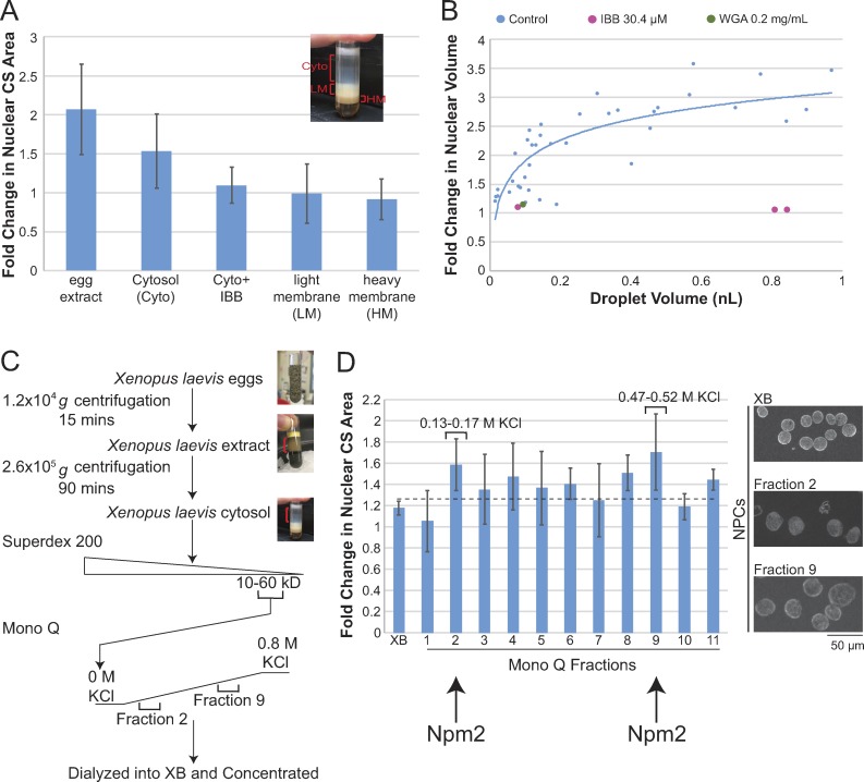 Figure 3. Fractionation approach to identifying factors limiting for nuclear growth. (A) X. laevis egg extract was subjected to high-speed centrifugation to separate the extract into cytosol (Cyto), light membrane (LM), and heavy membrane (HM). Stage 10 nuclei were incubated with the indicated fractions for 120 min. IBB, added at â¼30 µM, inhibits nuclear import (Weis et al., 1996). Nuclear CS areas were measured for at least 200 nuclei per condition and normalized to the preincubation nuclear size. Data from two independent experiments are shown. (B) Experiments were performed as in Fig. 1, CâE, except that extracts were supplemented with IBB or wheat germ agglutinin (WGA) to block nuclear import (Cox, 1992). For each experiment, 7â212 nuclei were quantified at each time point (53 nuclei on average). Data from three different extracts are shown. The control data are the same shown in Fig. 1 E. (C) Schematic diagram of the fractionation approach. See Materials and methods for details. (D) Mono Q fractions were dialyzed into XB and concentrated â¼10- to 20-fold. Stage 10 embryo extract and nuclei were supplemented with equivalent volumes of XB or Mono Q fractions and incubated for 90 min. Nuclei were fixed and stained with NPC antibody mAb414. Nuclear CS areas were measured and the fold change was calculated relative to the preincubation nuclear size. Means and SDs from three independent fractionation experiments are shown. At least 160 nuclei were quantified for each condition. The dotted line indicates the top of the error bar for the XB control. We selected fractions with the largest fold changes in nuclear size and with SD error bars above the dotted line, namely, fractions 2 and 9, which were shown by mass spectrometry to contain Npm2. Error bars represent SD. |