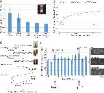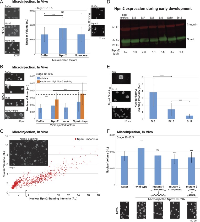 Figure 4. Npm2 levels affect in vivo nuclear size. (A) One-cell X. laevis embryos were microinjected with equivalent volumes of XB, recombinant Npm2 protein (to increase the Npm2 concentration by 3.5 µM) or recombinant Npm-core protein (3.5 µM final), allowed to develop to stage 10â10.5, and arrested in G2 with cycloheximide. Isolated nuclei were stained with an NPC antibody (mAb414), and nuclear volumes were measured for at least 74 nuclei per condition per experiment. 25 embryos on average were microinjected per condition. Data from four independent experiments and representative images are shown. Representative images to the right show nuclei stained with an antibody against Npm2. (B) Microinjections were performed as in A without cycloheximide arrest and including, where indicated, importin-α-E mRNA (350 pg total, Imp α). Importin-α-E is a phosphomimetic version of human importin α2 with reduced affinity for membranes (Levy and Heald, 2010; Wilbur and Heald, 2013). At least 330 nuclei were quantified per condition per experiment. Data from two independent experiments and representative images are shown. Orange bars represent sizes for nuclei with Npm2 staining intensity values >1 SD above the XB control (see also panel C). The dotted horizontal line at 3.5 pl corresponds to the predicted stage 10 nuclear volume resulting from a 3.5-µM introduction of Npm2 (see also Fig. S2 F). (C) Nuclei from microinjections described in B were stained with an antibody against Npm2. Nuclear volumes and total nuclear Npm2 staining intensities were measured for â¥330 nuclei per condition per experiment. 25 embryos on average were microinjected per condition, and two independent experiments were performed. For the Npm2 + importin α condition, individual nuclear volume was plotted as a function of nuclear Npm2 staining intensity. For XB-microinjected embryos, nuclear Npm2 staining intensity was 2.05 ± 1.35 (average ± SD). In panel B here and in Fig. S4 D, the orange bars represent data for nuclei with Npm2 staining intensity values greater than one SD above the XB control; therefore, nuclei with Npm2 staining intensities >2.05 + 1.35 = 3.4 (indicated by the open bracket on the x axis in C). (D) Equivalent volumes of egg and embryo extracts were analyzed by Western blot. Npm2 band intensities were normalized to β-tubulin levels and used to estimate the Npm2 concentration for each stage, given an egg extract Npm2 concentration of 4.2 µM. (E) Embryonic nuclei were stained for Npm2, and total nuclear Npm2 staining intensities were quantified for â¥148 nuclei per stage. (F) Microinjections were performed as in A with 1 ng of the indicated Npm2 mRNAs or an equivalent volume of water as a control. Mutants 1 and 2 have mutations in the histone-binding region of Npm2 (Warren et al., 2017), and mutant 3 is defective in histone chaperone activity (Salvany et al., 2004). We verified that these mutants are nuclear-import competent (data not shown). At least 900 nuclei were quantified per condition per experiment. Data from two independent experiments and representative images are shown. All statistical comparisons are to the water control. Two-tailed Studentâs t tests assuming equal variances; ***, P ⤠0.001; ns, not significant. Error bars represent SD. |