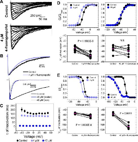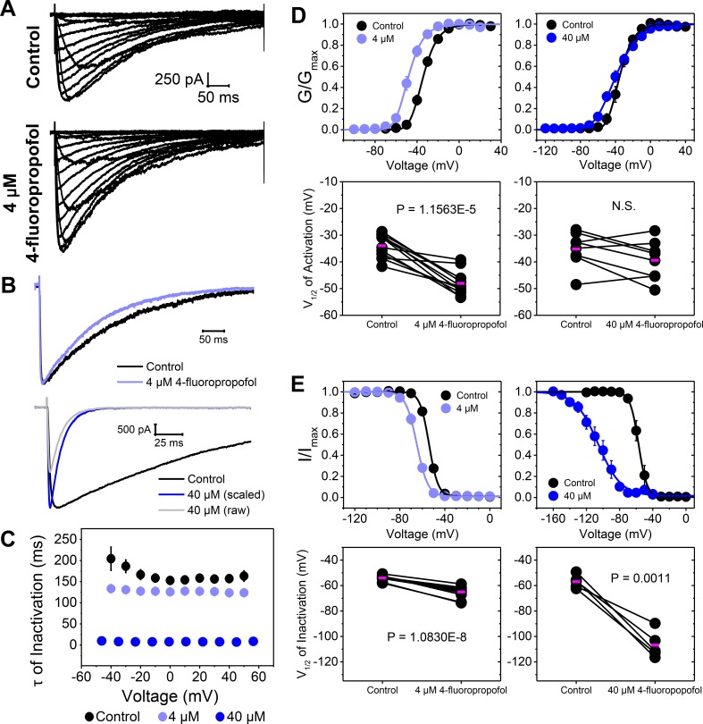 Figure 2. 4-Fluoropropofol modulates voltage-dependent activation and inactivation of NaChBac. (A) Representative paired current families in the absence (control) and presence of 4 µM 4-fluoropropofol. (B) Paired currents at +20 mV. The 4-µM 4-fluoropropofol trace is shown scaled to its respective control Ipeak. The 40-µM 4-fluoropropofol trace is shown both as a raw current and scaled to its respective control Ipeak. (C) Time constants of inactivation (τ) versus voltage of control (n = 20) and 4-fluoropropofol at 4 and 40 µM (n = 8–12). 4-Fluoropropofol reduced τInactivation at both concentrations and all voltages (P < 0.0001, paired t test). (D and E) Normalized G-V (D) and prepulse (E) inactivation curves of control and 4-fluoropropofol at the indicated concentrations (n = 5–12). Corresponding midpoints (V1/2) of activation and inactivation are shown below the corresponding curves. Means are indicated in magenta. Data are reported as mean ± SEM from n independent measurements.