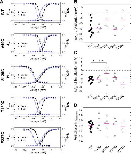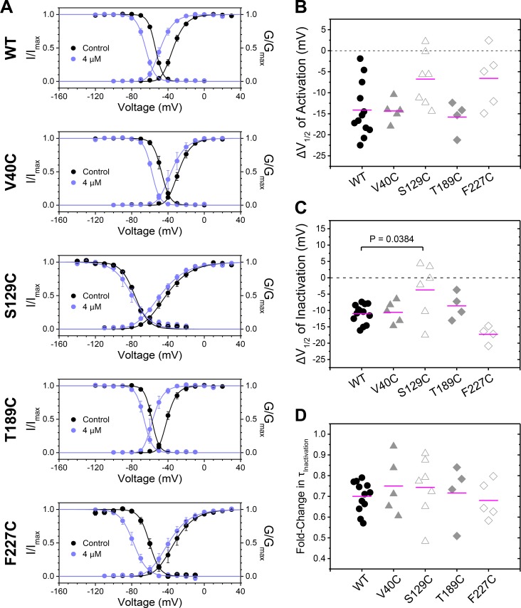 Figure 4. Effects of single-cysteine mutations on NaChBac modulation by 4-fluoropropofol. (A) Paired G-V and prepulse inactivation curves without (black) and with (light blue) 4 µM 4-fluoropropofol (n = 4–13) for WT and each NaChBac mutant. (B and C) ΔV1/2 values of activation (B) and inactivation (C) induced by 4 µM 4-fluoropropofol for WT and NaChBac mutants. The ΔV1/2 values of activation were not significantly different between WT and the mutants. Of the four mutants, only S129C shows significantly different ΔV1/2 of inactivation from the WT (P = 0.0384, one-way ANOVA with Bonferroni post hoc correction). (D) Fold-change in time constants (τ) of inactivation (τ4-fluoropropofol/τcontrol) at +20 mV induced by 4 µM 4-fluoropropofol. Time constants were derived from the decaying phase of the Na+ currents, which were well described by the single exponential function. For all mutants, the fold-change in τInactivation caused by 4 µM 4-fluoropropofol was not significantly different from that of WT (one-way ANOVA with Bonferroni post hoc correction). Data are reported as mean ± SEM from n independent measurements.
