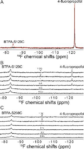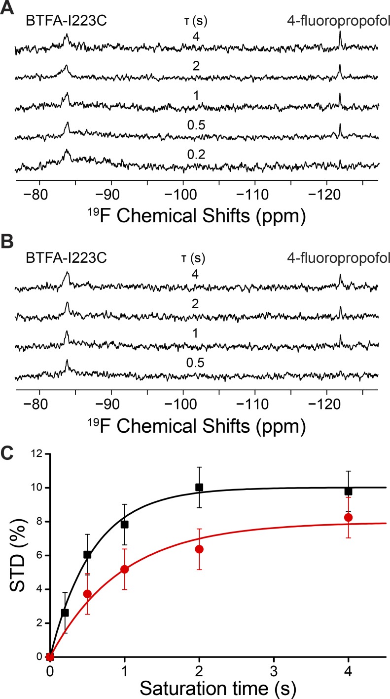 Figure 5. 19F-NMR measurements of 4-fluoropropofol binding to NaChBac. (A) Representative 19F-NMR spectra of the BTFA-labeled S129C NaChBac mutant in the presence of 200 µM 4-fluoropropofol with selective on- (black, Ion) and off-resonance (red, Ioff) saturation of the BTFA peak. The saturation time was 2 s. (B) Stack plot of 19F STD NMR spectra showing that 4-fluoropropofol interacts specifically with the BTFA labeled at S129C for intermolecular saturation transfer to be built up at longer saturation time (Ï). (C) Stack plot of 19F STD NMR spectra showing that 4-fluoropropofol has no measurable interaction with the negative control BTFA-labeled S208C NaChBac.