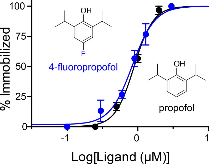 Figure 1. In vivo anesthetizing concentrations of propofol and 4-fluoropropofol in albino X. laevis tadpoles are identical. The percentage of immobilized tadpoles is plotted as a function of propofol and 4-fluoropropofol concentrations. The solid lines are best fit to the data by using Eq. 4. Error bars show the SEMs from three independent measurements with 10 tadpoles per measurement at each drug concentration.