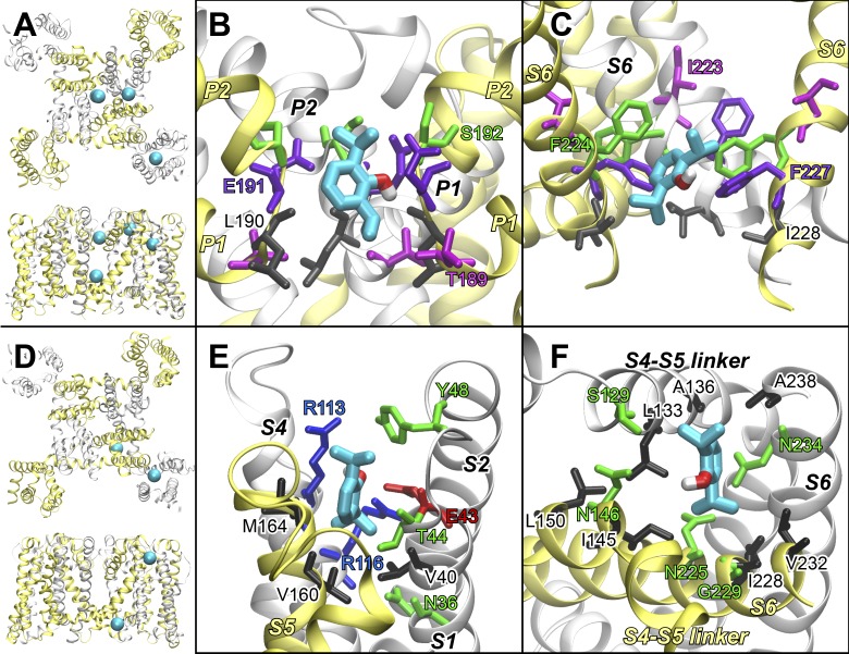 Figure 3. In silico predicted propofol binding sites in NaChBac. (A) Top and side views of a NaChBac structure model with putative propofol binding sites identified by molecular docking (cyan spheres, occupancy ⥠10%). (B and C) Zoomed-in views of the lowest energy conformation from docking calculations of propofol (cyan) bound to NaChBac inside the pore at the selectivity filter (B) and above the activation gate (C). Residues in close proximity to the docked propofol are shown as sticks labeled with the corresponding color. Note that residues selected for 19F labeling in STD NMR experiments (T189, I223, F227) are within the binding sites but unlikely to be essential for propofol binding to these regions. (D) Top and side views of NaChBac from the final frame of the 1-µs flooding MD simulation with putative propofol-binding sites (cyan spheres, occupancy ⥠90%). (E and F) Zoomed-in views of propofol bound to NaChBac in the final frame of the 1-µs flooding MD simulation in the apex of the voltage-sensing domain (E) and an intersubunit site at the intracellular interface (F). Residues in close proximity to the docked propofol are shown as sticks labeled with the corresponding color. Note that residues selected for 19F labeling in STD NMR experiments (N36, V40, S129, L150) are within the binding sites but unlikely to be essential for propofol binding to these regions.