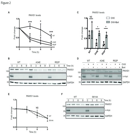 R52P were treated with 100 µg/ml cycloheximide for the indicated times prior to sample collection. PAWS1 band intensities were measured, normalised to GAPDH loading control, and represented relative to the respective 0 h samples (n=3, error bars represent ± SD). Representative blots are shown in (
