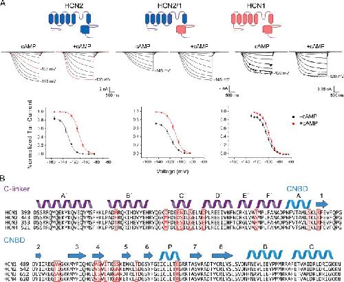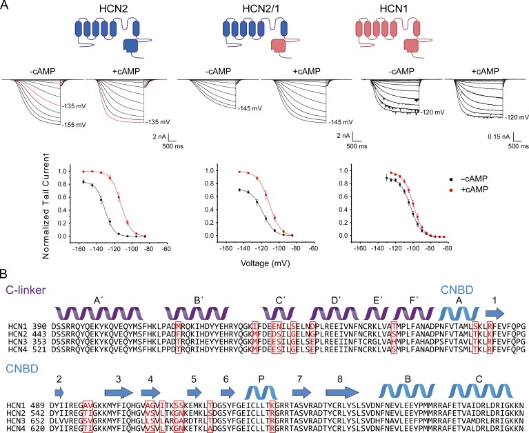 Figure 1. Voltage dependence and sequence comparison of HCN1, HCN2 and chimeric HCN2 with C-linker and CNBD of HCN1. (A) Representative current traces in the inside-out configuration and conductanceâvoltage curves obtained in the presence and absence of 10 µM cAMP. The same patch was recorded in both conditions. Tail currents from HCN2 (n = 19 patches), HCN2/1 (n = 19), and HCN1 (n = 21) were normalized to the maximum fitted tail current recorded in the presence of cAMP for each patch. Data presented are mean ± SEM. (B) Sequence alignment and secondary structures of mouse HCN1â4. The 18 residues that differ between HCN1 and HCN2 are highlighted in red.