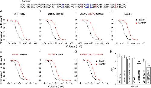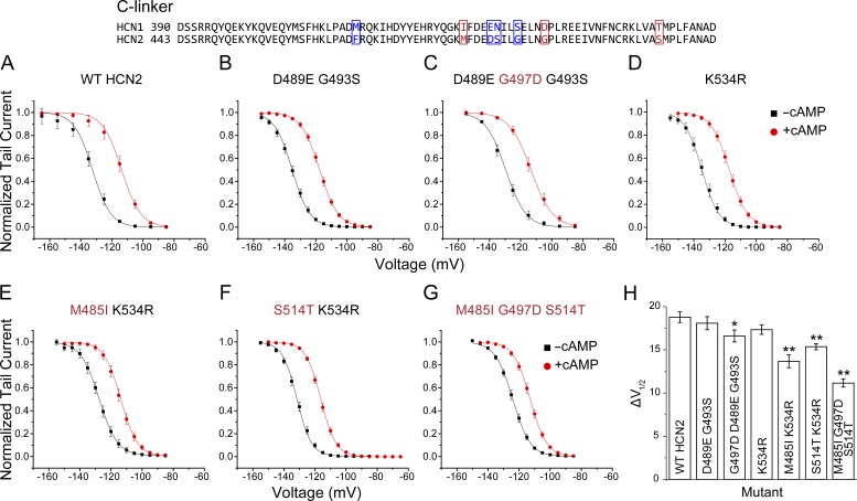 Figure 2. C-linker residues critical for isoform-specific modulation of HCN2 by cAMP. Top: Alignment of the C-linker of HCN1 and HCN2 illustrating in red the residues that were found to have effects on the response of HCN2 to cAMP. The remaining residues that differ between isoforms are shown in blue. (AâG) Normalized conductanceâvoltage curves in the presence and absence of cAMP obtained by measuring tail currents of WT HCN2 and various C-linker substitutions with equivalent HCN1 residues. Mutations that significantly decreased the cAMP-dependent ÎV1/2 are labeled red. (H) Summary of the shifts in the midpoints of activation (ÎV1/2) induced by cAMP for the mutants shown in AâG. *, P = 0.02; **, P < 0.00003 versus WT HCN2. The numbers of patches recorded per mutant were HCN2 (n = 19), D489E G493S (n = 21), D489E G497D G493S (n = 21), K534R (n = 18), M485I K534R (n = 14), S514T K534R (n = 19), and M485I G497D S514T (n = 18). Data presented are mean ± SEM.