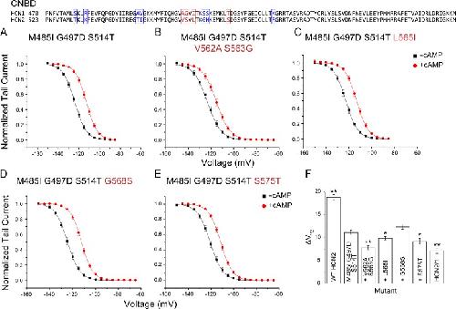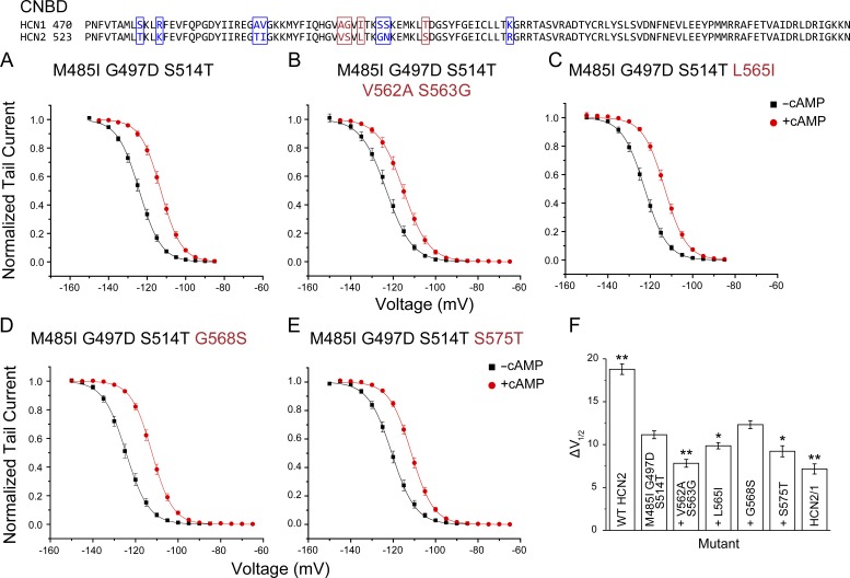 Figure 3. CNBD residues critical for isoform-specific modulation of HCN2 by cAMP. Top: Alignment of the CNBD of HCN1 and HCN2 illustrating in red the residues that were found to have effects on the response of HCN2 to cAMP. The remaining residues that differ between isoforms are shown in blue. (AâE) Normalized conductance-voltage curves in presence and absence of cAMP obtained by measuring tail currents of HCN2 carrying various CNBD substitutions. Labeled red are CNBD mutations in the background of the previously identified nonneutral C-linker mutations. (F) Summary of the shifts in the midpoints of activation (ÎV1/2) induced by cAMP for the mutants shown in AâE. The background of the CNBD mutations tested (the triple mutant M485I G497D S514T) is abbreviated by a plus sign (+) in the mutant labels. *, P < 0.04; **, P < 0.00001 versus the triple mutant M485I, G497D, and S514T. The numbers of patches recorded per mutant were M485I G497D S514T (n = 18), M485I G497D S514T V562A S563G (n = 21), M485I G497D S514T L565I (n = 22), M485I G497D S514T L565I (n = 21), M485I G497D S514T S575T (n = 21), and HCN2/1 (n = 19). Data presented are mean ± SEM.