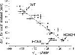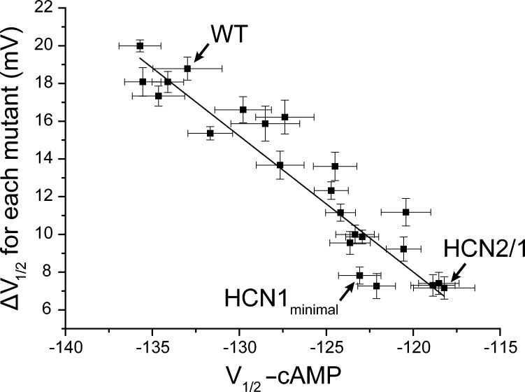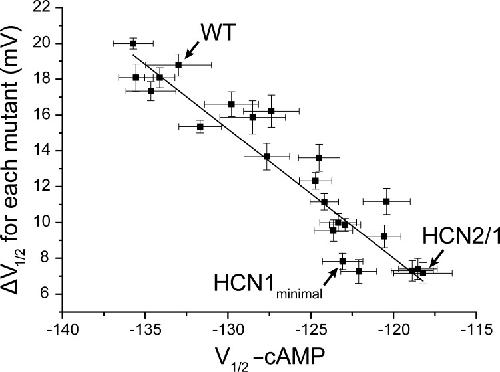 Figure 5. The extent of cAMP-induced shifts correlates with intrinsic midpoints of activation of various mutants. Plot of the cAMP-induced shifts in V1/2 (ΔV1/2) against the V1/2 in the absence of cAMP for all mutants reported in this study. The correlation coefficient is 0.92.