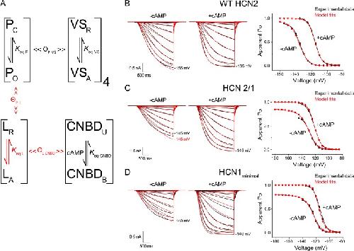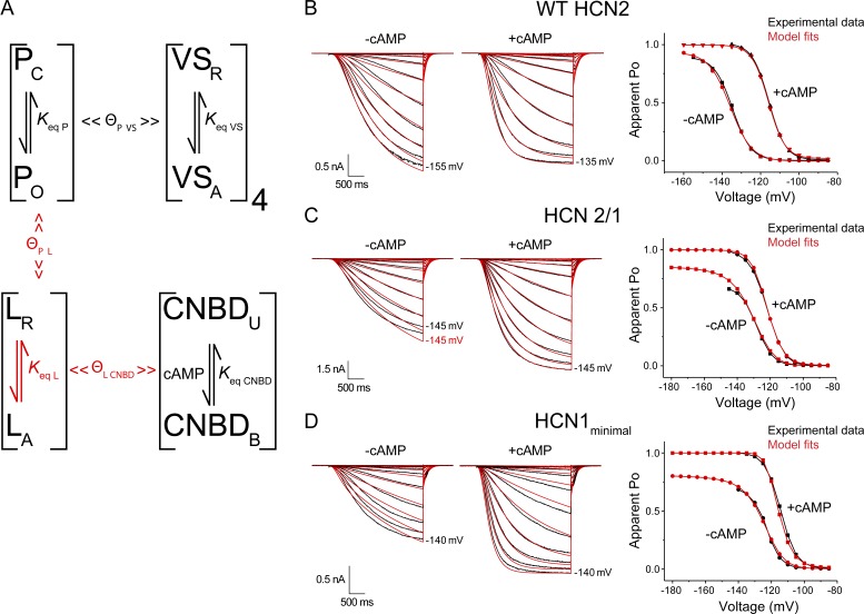 Figure 6. Allosteric models recapitulate the various voltage- and ligand-dependent properties of WT HCN2, the HCN2/1 chimera, and the HCN1minimal mutant. (A) Schematic representation of the various allosteric elements and interactions implemented in Scheme 4. Binary elements for the pore (P), voltage sensors (VS), linker (L), and binding domain (CNBD) are characterized by equilibrium constants (Keq) between two states. Coupling factors (Î) characterize the interactions between elements. All the parameters, except those marked in red, were kept constant to fit the kinetic and steady-state data for WT HCN2, HCN2/1, and the HCN1minimal mutant. (BâD) Model fits (red) and experimental data (black) of current traces in response to voltage steps in the presence and absence of cAMP. Reference data for the apparent Po-voltage curves (right) were obtained from the steady-state conductances at the end of each pulse and are compared with the maximum probability of the open state calculated for the model. Refer to Tables S2, S3, and S4 for a complete list of all parameters.