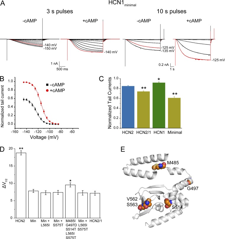 Figure 4. The voltage-dependent modulation of the HCN1minimal mutant (with substitutions M485I, G497D, S514T, V562A, and S563G) is similar to the HCN2/1 chimera. (A) Representative traces of inside-out recordings for the HCN1minimal mutant in the absence and presence of 10 µM cAMP. For comparison, because of the slow kinetics in this mutant, recordings obtained with 10-s voltage pulses to ensure that the currents are saturated even in absence of cAMP are shown. (B) Conductanceâvoltage curves for the HCN1minimal mutant normalized to the maximum tail current in the presence of cAMP. (C) Tail currents at saturating voltages in absence of cAMP for WT HCN2 (n = 14 patches), WT HCN1 (n = 21), HCN2/1 (n = 19), and the HCN1minimal mutant (n = 21), calculated relative to the maximum tail current in saturating voltages and cAMP for each patch. *, P = 0.01; **, P < 0.00003 compared with WT HCN2. (D) Additional mutations L565I and S575T do not affect cAMP-dependent ÎV1/2 in the HCN1minimal (Min) background. n = 19 for WT HCN2, 21 for HCN1minimal, 19 for Min + L565I, 18 for Min + S575T, 17 for M485I G497D S514T L565I S575T, 20 for Min + L565I S575T, and 19 for HCN2/1. *, P = 0.03; **, P = 5 à 10â17 versus the HCN1minimal mutant. For conductanceâvoltage curves, see Fig. S3. Data presented are mean ± SEM. (E) HCN2 structure (PDB accession no. 3U10) showing the residues mutated in the HCN1minimal mutant (Lolicato et al., 2011).