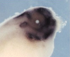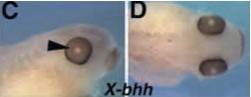 ihh9 (indian hedgehog) gene expression in Xenopus laevis eye.C Retina of stages 34-36 embryo. D Retina of stage 42 embryo. Expression is in the RPE. |