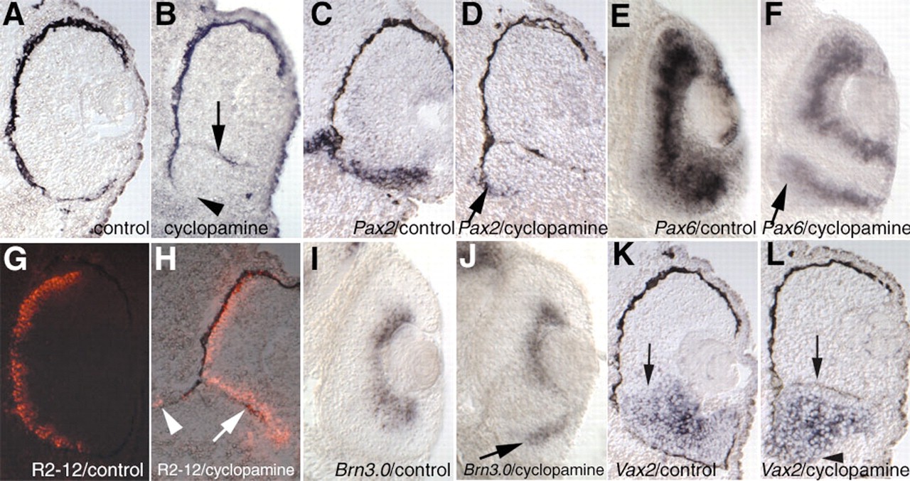 Fig. 7. Cyclopamine treatment leads to proximodistal defects. A brightfield view of a retina of an embryo incubated in cyclopamine from the two-cell stage (B) shows no closure of the ventral RPE (arrowhead) and ectopic pigment in the central retina (arrow) compared with a control retina (A). In situ hybridisation or immunostaining on retinal sections of stage 39 embryos incubated in cyclopamine solution from the two-cell stage (D,F,H,J,L) or control embryos (C,E,G,I,K). The probes or the antibodies are indicated for each panel. All sections are 12 μm cryostat sections except in E,F,I,J, which are 50 μm vibratome sections. Pax2 expression is strongly reduced in the cyclopamine-treated retina. Only a faint expression remains (arrow in D). Pax6 expression invades the optic stalk region (arrow in F). Ectopic photoreceptors are detected in the optic stalk region (arrowhead in H) and in the central retina along the ectopic pigment (arrow in H). Brn3.0 expression is detected in the optic stalk region (arrow in J). Vax2 expression is also moved towards the optic stalk region (arrowhead in L) but is still present and restricted to the ventral part only, as in the control (K). The dorsoventral borders are indicated with arrows in K and L. |