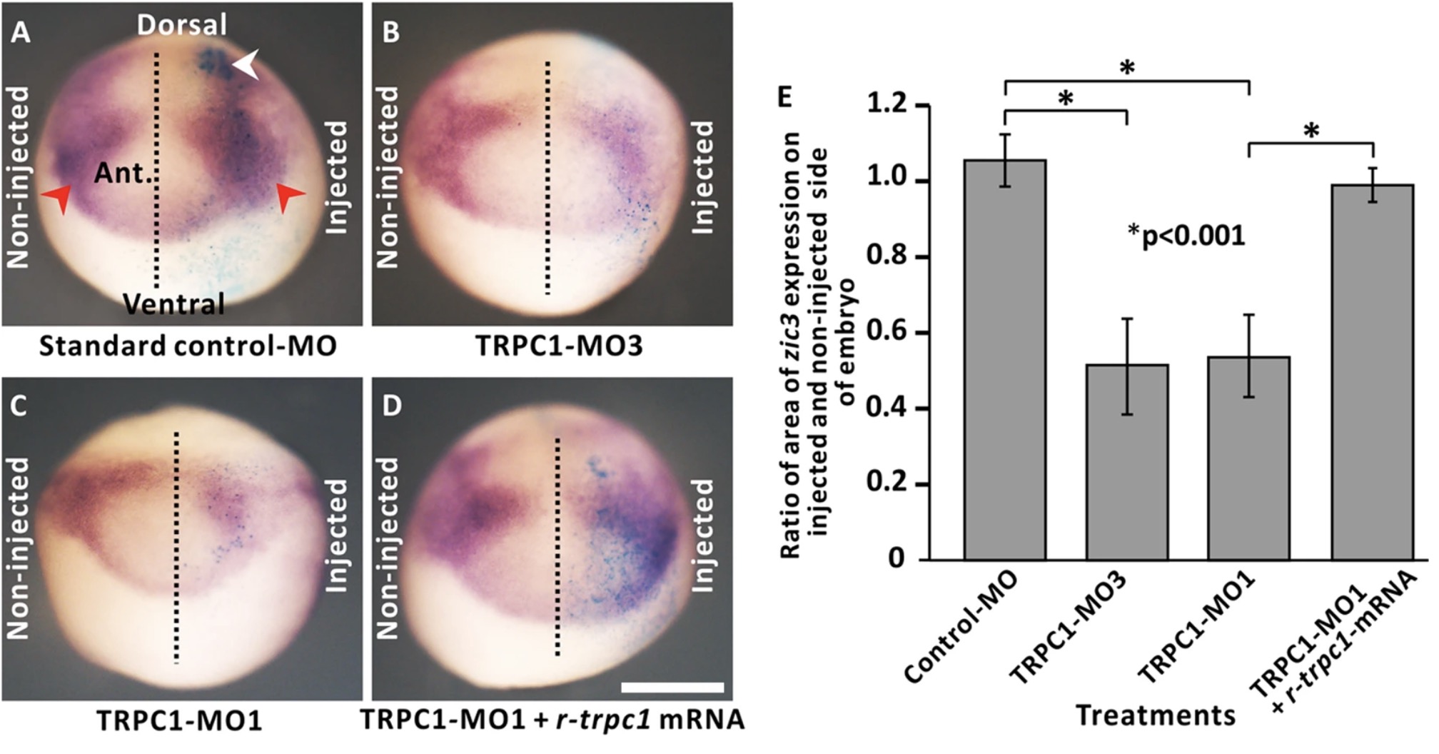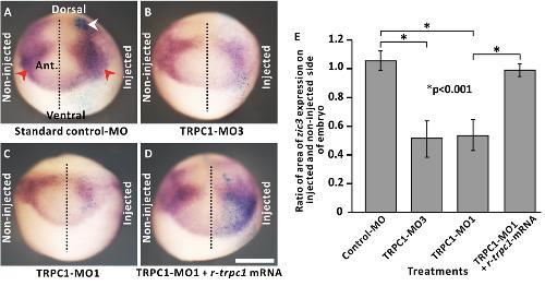 Figure 6. trpc1 knock-down impairs the expression of the early neural gene, zic3. Embryos were co-injected at the 8-cell stage into a single dorsal animal blastomere with nuclear β-galactosidase mRNA and: (A) the standard control-MO, (B) a splice-blocking MO (TRPC1 -MO3), (C) TRPC1- MO1, or (D) TRPC1- MO1 plus r-trpc1 mRNA. Embryos were then fixed at stage 14 for subsequent whole-mount in situ hybridization of zic3; see red arrowheads in panel (A). The side of the embryo injected with MOâ±âr-trpc1-mRNA was confirmed by reaction of β-galactosidase with X-Gal, as shown by the blue labelling on the right side of each embryo; see white arrowhead in panel (A). Scale bar is 500 µm. (E) A bar chart showing the meanâ±âS.E.M. (nâ=â17) ratio of the area of zic3 expression on the injected and un-injected sides of the embryo. The asterisks indicate data that are significantly different at pâ<â0.001 when using one-way ANOVA and the Tukeyâs honest significance post-hoc test. |