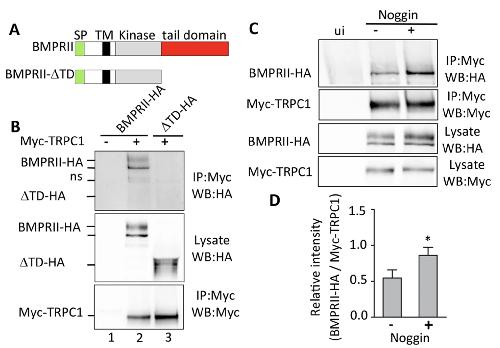 Figure 7. The tail domain of BMPRII is essential for the interaction with Trpc1, and noggin modulates the BMPRII-Trpc1 interaction. (A) Schematic illustration of the full-length BMPRII and the tail domain-deleted construct (BRII-âTD). The yellow, black, grey and red rectangles show the signal peptide (SP); transmembrane domain (TM), kinase domain, and tail domain respectively. (B) Representative western blots showing the immunoprecipitation data acquired when analysing the protein-protein interaction between BMPRII and Trpc1. Embryos at the 4-cell stage were either injected (+) or not (â) with BMPRII-HA (200 pg/cell) or BRII-âTD-HA (200 pg/cell), along with Myc-Trpc1 (200 pg/cell) into all the blastomeres. Animal caps were then prepared at stage 8â9, lysed and subjected to immunoprecipitation. ns, non-specific band. Western blot data were revealed by enhanced chemiluminescence (ECL; nâ=â4 independent experiments). (C) Representative western blots showing the interaction between BMPRII and TRPC1 in the presence of noggin. Animal caps were collected at stage 8â9 from embryos injected with BMPRII-HA (200 pg/cell) and Myc-Trpc1 (200 pg/cell) into all the blastomeres at the 4-cell stage, after which they were either incubated (+) or not (â) with 2 µg/mL noggin for 15 min, and then lysed and subjected to immunoprecipitation with anti-Myc antibody. The western blot data were revealed by ECL (nâ=â3 independent experiments). (D) Quantification of the BMPRII-HA fraction associated with Myc-Trpc1. Ratios of co-immunoprecipitated BMPRII-HA: Myc-Trpc1 were calculated in the absence or presence of noggin using the Bio-Rad ChemiDoc Image Lab software 5.2.1. There data represent the meanâ±âfrom 3 independent experiments. The asterisk indicates data that are significantly different at pâ<â0.05 when using the Mann-Whitney test. The full-length blots are presented in Supplementary figure S7. |