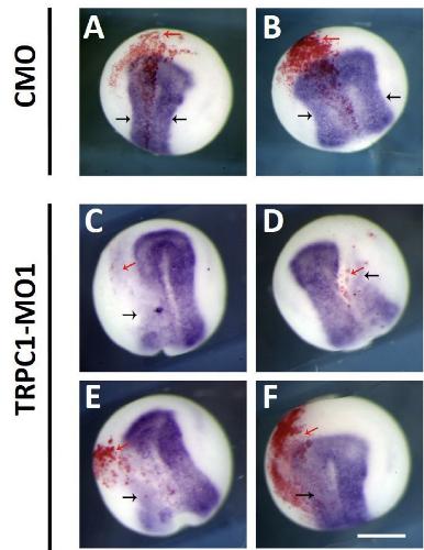Figure S4: trpc1 knock-down impairs the expression of the early neural gene, sox2. Embryos were co-injected at the 8-cell stage into a single dorsal animal blastomere with nuclear β-galactosidase mRNA (150 pg) and either (A,B) the standard control-MO (CMO; 17 ng) or (C-F) TRPC1-MO1 (17 ng). Embryos were then fixed at stage 14 for subsequent whole-mount in situ hybridization for sox2; see black arrows. The side of the embryo injected with MO was confirmed by reaction of β-galactosidase with Red-Gal, as shown by the red labelling on each embryo; see red arrows. (A-B) Images from 2 different embryos injected with CMO showing similar levels of sox2 expression on the left and right side of the embryos. (C-F) Images from 4 different embryos injected with TRPC1-MO1 showing that the expression of sox2 was reduced (see black arrows) on the injected side. Scale bar 500 µm |