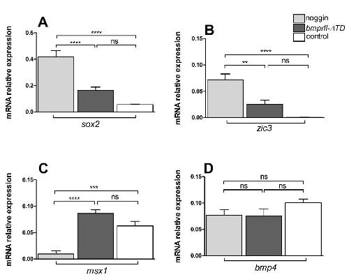 Figure S6. The truncated form of BmprRII (BmprII-deltaTD) has no neural inducing activity. RT-qPCR analysis of two neural genes, zic3 (A) and sox2 (B), and two genes controlling epidermal fate, msx1 (C) and bmp4 (D), in noggin-treated stage 9 animal caps (grey bars), in animal caps over-expressing bmprII-deltaTD (black bars) and in control animal caps (white bars). Expression was normalized to the housing keeping gene odc (ornithine decarboxylase). When comparing the level of expression of these 4 genes in animal caps over-expressing bmprII-deltaTD, with the level of expression in noggin treated and control animal caps, these data indicate that bmprII-deltaTD has no neural inducing activity, (one way ANOVA with Bonferroniâs test, **P<0.001, ****P<0.0001). The data represent the mean ± SEM of 8 independent experiments, with 20 animal caps in each experiment. |