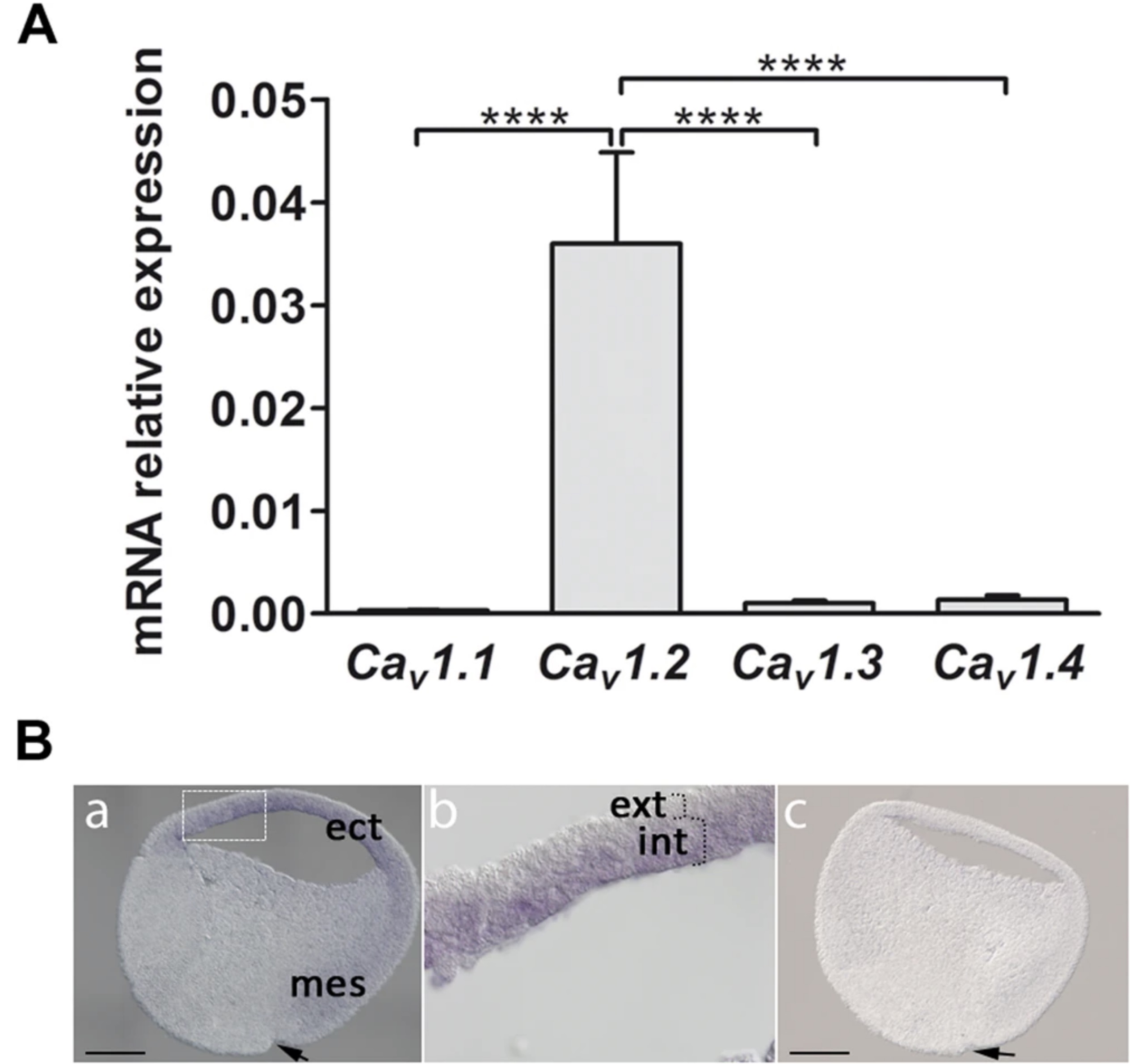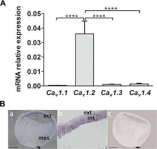 Figiure 1. Expression of CaV1.2 mRNA in X. laevis. (A) RT-qPCR analysis of Cav1.1, Cav1.2, Cav1.3 and Cav1.4 in ectoderm (animal caps) isolated before gastrulation at stages 8 and 9. The expression levels were normalized to the housing keeping gene odc (ornithine decarboxylase). The level Cav1.2 mRNA was significantly higher than that of Cav1.1, Cav1.3 and Cav1.4 (one way ANOVA with Bonferroniâs test, ****Pâ<â0.0001). The data represent meanâ±âSEM of 9 independent experiments such that 20 animal caps were used for each experiment. (B) In situ hybridization to show the pattern of localization of CaV1.2 mRNA in sections acquired at early gastrula (stage 10). (Ba) Photomicrograph of a sagittal section labelled with the anti-sense probe, which shows CaV1.2 expression in the ectoderm (ect) and dorsal mesoderm (mes). There is no CaV1.2 expression in the ventral mesoderm. (Bb) Higher magnification view of the ectoderm (corresponding to the white dashed rectangle in panel (Ba), which shows that CaV1.2 is expressed in the internal layer (int) but not in the external layer (ext). (Bc) Photomicrograph of a sagittal section showing no labelling with the sense probe. In (Ba-Bc), dorsal is to the right and the arrows indicate the dorsal blastopore groove. Scale bars are 300 µm. |