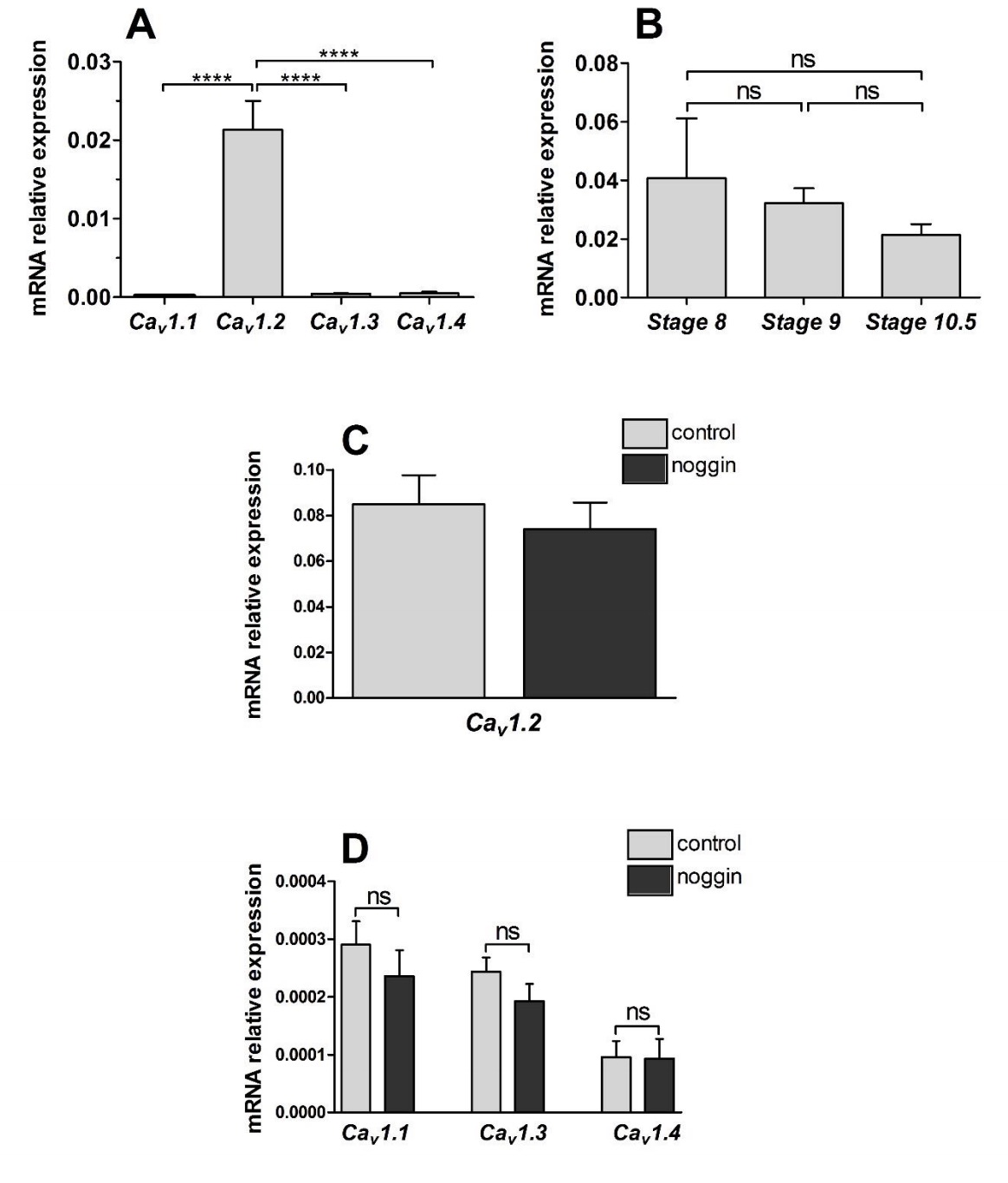 Figure S1: Expression of CaV1.x mRNA in X. laevis. (A) RT-qPCR analysis of Cav1.1, Cav1.2, Cav1.3 and Cav1.4 in ectoderm (animal caps) isolated at mid-gastrula (stage 10.5). The expression levels were normalized to the housing keeping gene odc (ornithine decarboxylase). The expression level Cav1.2 mRNA was significantly higher than that of Cav1.1, Cav1.3 and Cav1.4, in animal caps (one way ANOVA with Bonferroniâs test, ****P<0.0001). The data represent the mean ± SEM of 4 independent experiments, with 20 animal caps being used for each experiment. (B) RT-qPCR analysis of Cav1.2 in ectoderm (animal caps) isolated from embryos before gastrulation (stage 8 and stage 9) and at midgastrula (stage 10.5). The expression levels were normalized to the housing keeping gene odc (ornithine decarboxylase). No significant changes in Cav1.2 mRNA levels occurred during these 3 stages (one-way ANOVA with Bonferroniâs test, P<0.05). The data represent the mean ± SEM of 4 and 5 independent experiments for stage 8 and 10.5, and for stage 9, respectively, such that in each experiment there were 20 animal caps. (C-D) Histograms to show RT-qPCR analysis of Cav1.2 (C) and of Cav1.1, Cav1.3 and Cav1.4 (D) in control stage 9 animal caps and in noggin-treated stage 9 animal caps. The level of expression was normalized to the housing keeping gene odc (ornithine decarboxylase). No significant changes in the mRNA levels of Cav1.1, Cav1.2, Cav1.3, and Cav1.4 were observed when comparing control and noggin-treated animal caps (Mann-Whitney test). The data represent the mean ± SEM of 10 independent experiments, with 20 animal caps per experiment. |