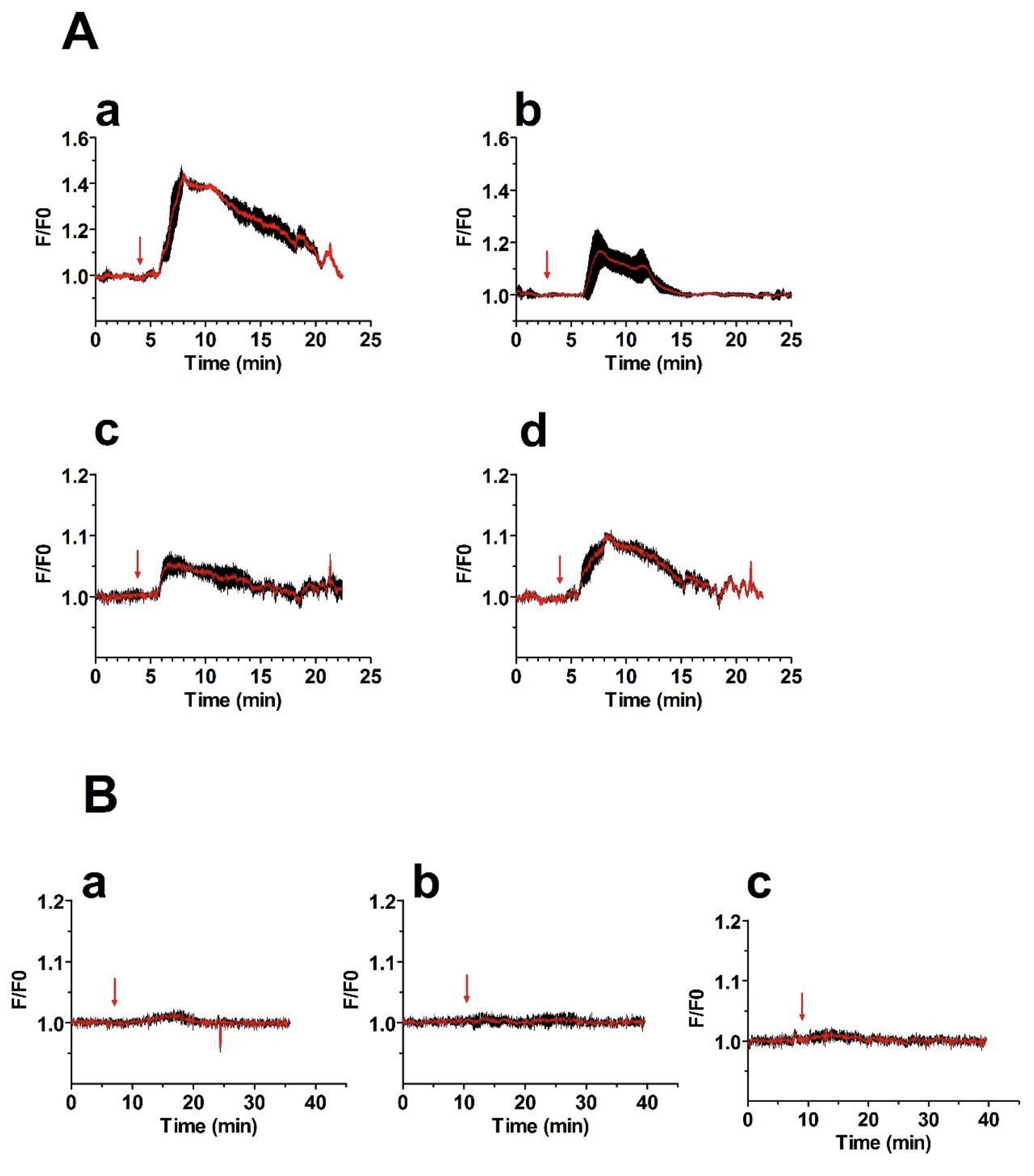 Figure S3: Trpc1 knock down abolishes the increase in intracellular Ca2+ generated following the activation of CaV1.2 channels in animal cap explants. (A-B) Relative changes in fluorescence (F/F0) reveal changes in intracellular Ca2+ generated in a single animal cap loaded with the Ca2+ -indicator Fluo4 after being isolated from an embryo injected with either (A) control-MO or (B) TRPC1-MO1. In (A) panels (a-d), and in (B) panels (a-c), the graphs show examples of 4 and 3 independent experiments, respectively. Values are plotted as the F/F0 mean (red traces) + SEM (black bars) from 4 (A) or 10 (B) randomly selected fields within a single animal cap. Noggin (3 µg/mL) was added (blue arrows) within the first 10 min after the start of data acquisition. |