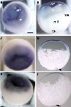 Figure 2. trpc1 is expressed in the ectoderm of blastula and gastrula stage embryos. Spatial expression of trpc1 mRNA in blastula and gastrula stage embryos. Whole mount in situ hybridization was performed on embryos fixed at blastula (stage 9), early gastrula (stage 10.5) and late gastrula (stage 11.5). (A) Expression of trpc1 at stage 9 in an intact embryo (animal pole view), showing that the ectoderm is labelled. (B) Sagittal section taken through the embryo shown in panel A, indicating trpc1 expression in the ectoderm alone; the mesoderm and endoderm were not labelled. (C) Expression of trpc1 in an intact embryo at stage 10.5 (animal pole view). (D) Sagittal section taken through the embryo shown in panel (C), showing trpc1 expression in the ectoderm, with no difference in the level of expression between the dorsal and the ventral sides. (E) Expression of trpc1 in an intact embryo at stage 11.5 (animal pole view). (F) Sagittal section taken through the embryo shown in panel E. AP, VP, ect, mes, end and Bl are animal pole, vegetal pole, ectoderm, mesoderm endoderm and blastocoel, respectively. In panels (D) and (F), dorsal is to the right and the arrows indicate the blastopore lip. Scale bar is 300 µm. |