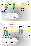 Figure 8. Hypothetical model to depict the role of Trpc1 channels in linking the inhibition of BMP pathway by noggin, and the activation of Cav1.2 channels in ectodermal cells. During gastrulation, the cells of the embryonic ectoderm have the choice between two fates; they can give rise to either epidermal or neural progenitors. In the plasma membrane, the molecular components involved in this choice are BMP receptors type I (BmprI) and type II (BmprII), Trpc1 and voltage-dependent Ca2+ channels (Cav1.2). The membrane potential in the ectoderm is ~â60 mV; i.e., the interior is negatively charged62. (A) Induction of the epidermis occurs through a signalling cascade, which involves the binding of Bmp4 to its receptor, and then the transphosphorylation of BmprII by BmprI. This is followed by the activation of Smads, which translocate into the nucleus to form active transcriptional complexes to control the expression of epidermal genes. In this scenario, there is no interaction between Trpc1 and BmprII, and Cav1.2 remains inactive. (B) During neural induction, noggin binds to BMP4, and thus prevents the activation of the BMP pathway. As a consequence, it induces a physical interaction between BmprII and Trpc1 channels. This interaction leads to the activation of Trpc1, which either alone or associated with other Trp channels (e.g., Trpv4), triggers an influx of cations (Ca2+ and Na+). This influx of cations depolarizes the membrane (i.e., there is more positive charge inside) up to a threshold sufficient to open the voltage-gated Ca2+ channel, Cav1.2. As we have previously shown27,29, the resulting influx of Ca2+ is then sufficient to activate the expression. |